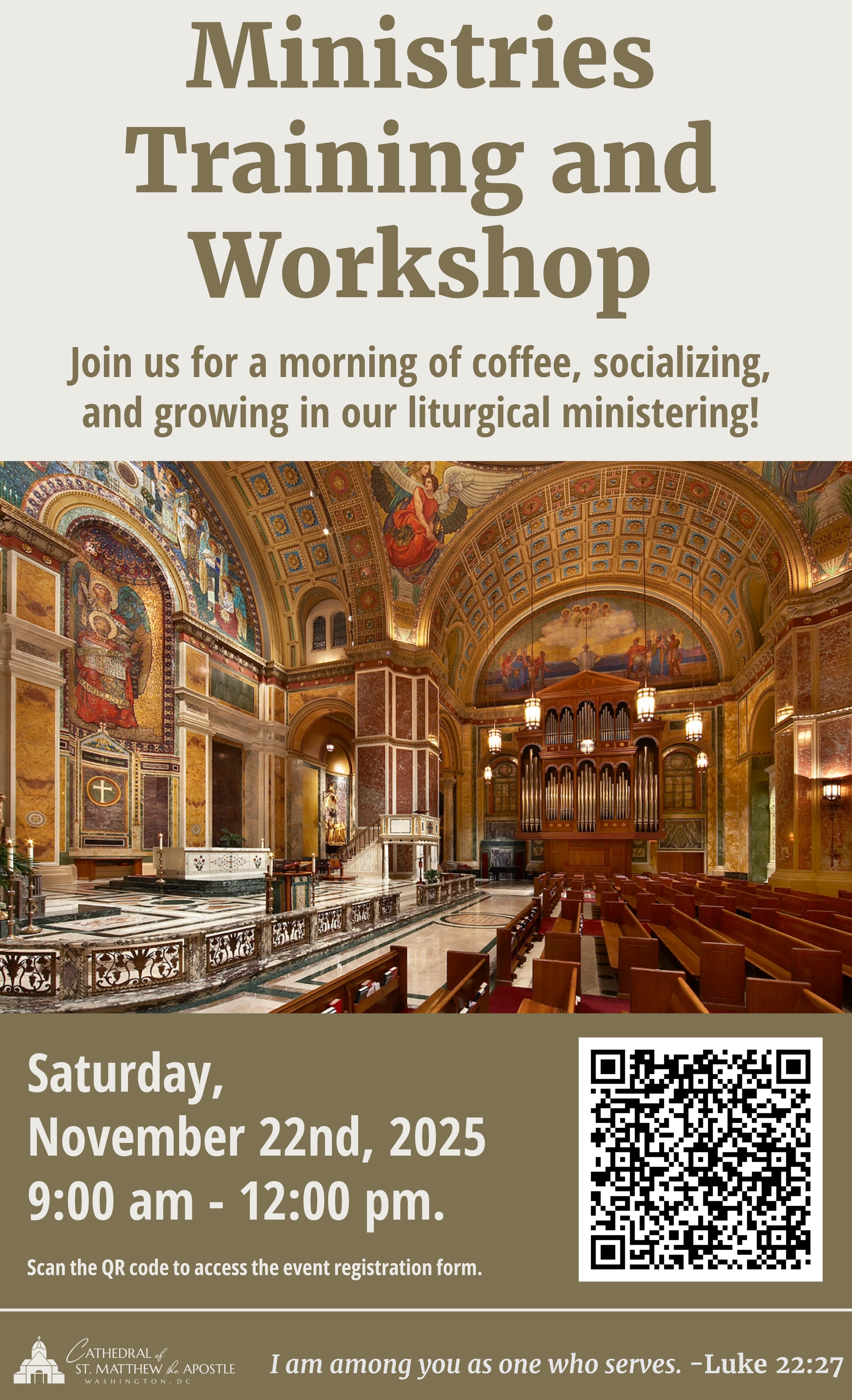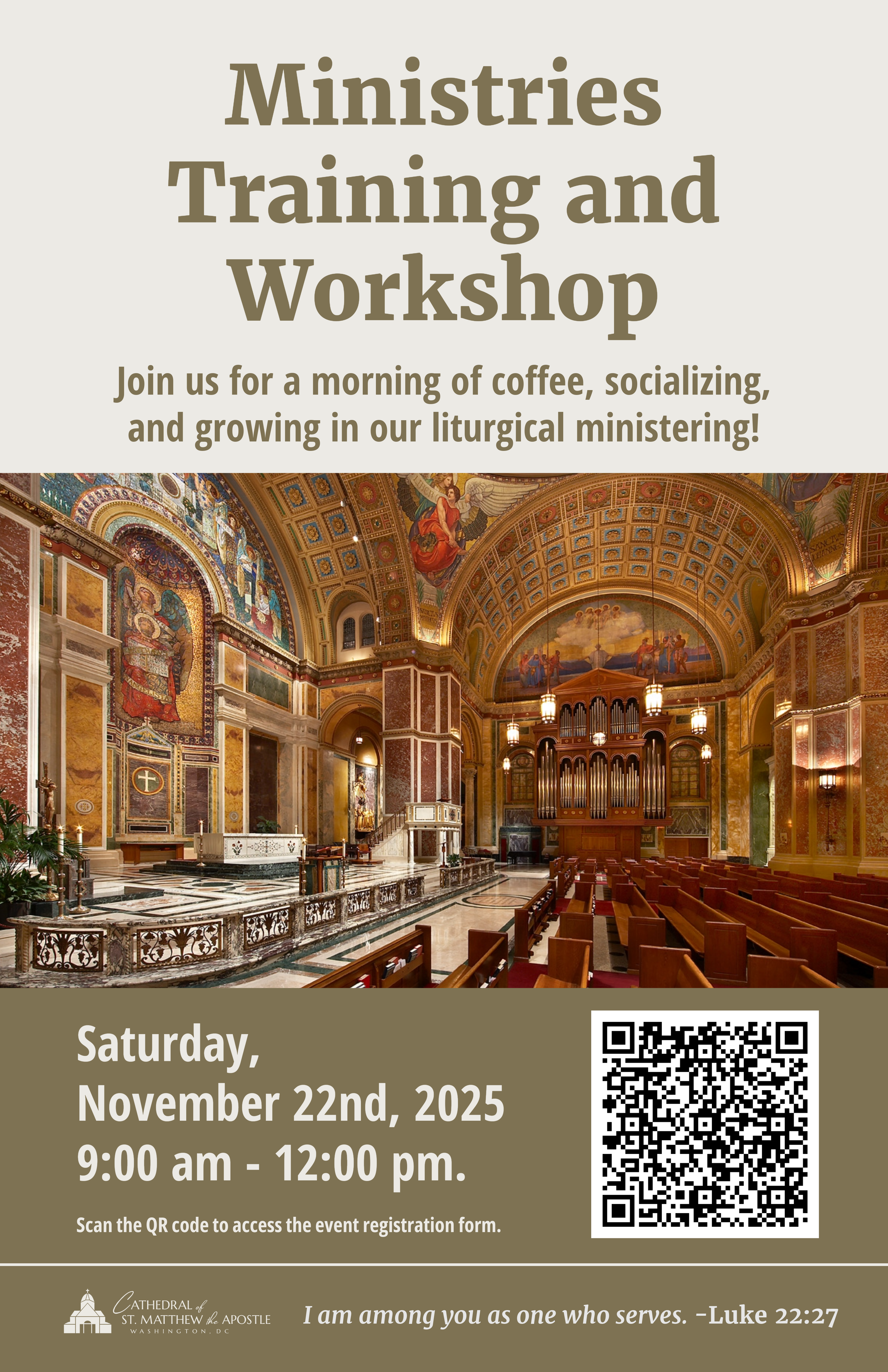 Join us for a morning of coffee, socializing, and growing in our liturgical ministering! This is a Saturday morning gathering for new and current liturgical ministers to get to know each other better and share in the joy of this ministry. This is our annual BIG training for all liturgical ministers, to include time in the Cathedral itself for hands-on learning. Please mark your calendars, RSVP here, and join us on Saturday, November 22, from 9am to Noon, beginning in the North Conference Room.