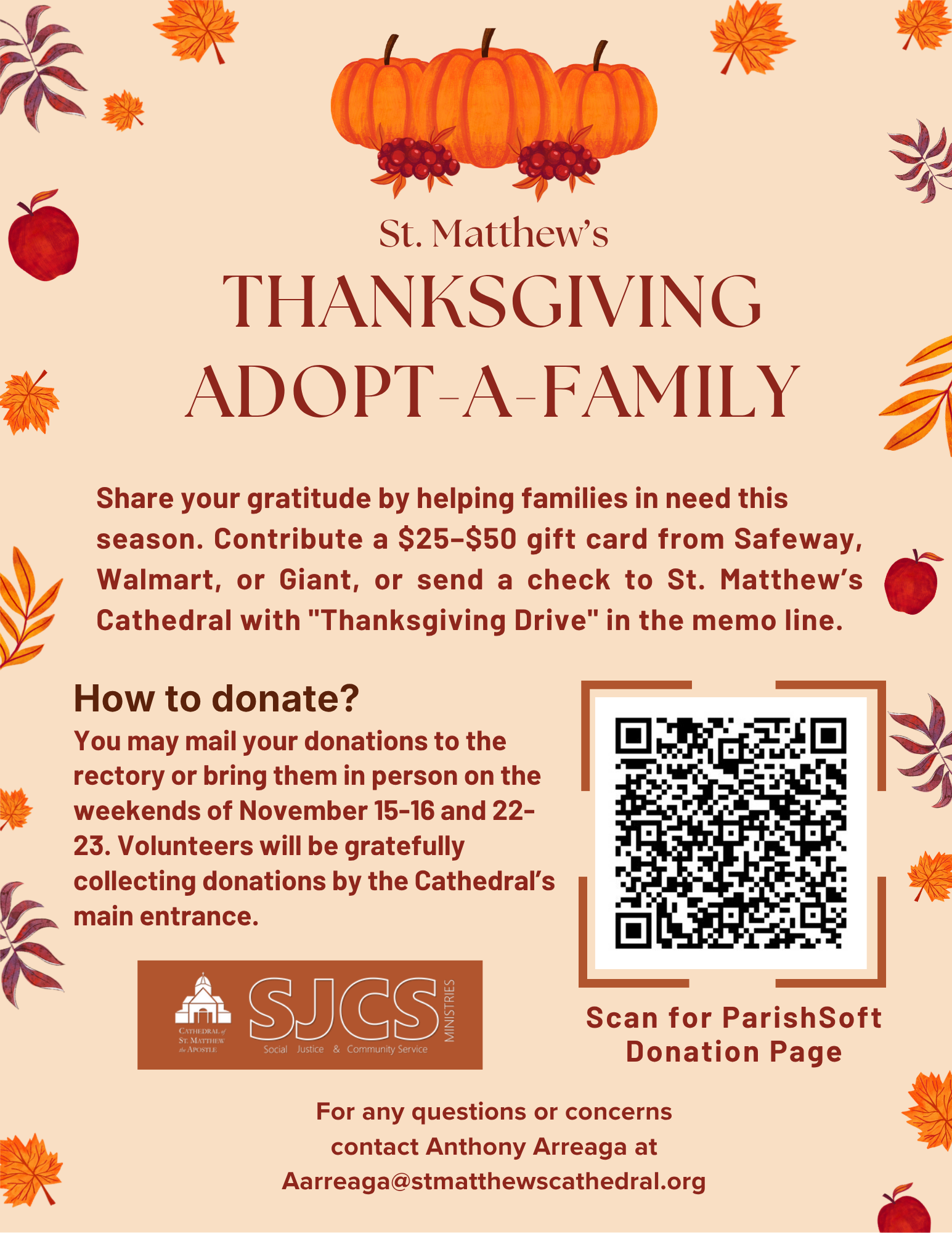St. Matthew's Social Justice Committee is collecting donations of grocery store gift cards to distribute to families in need this Thanksgiving. Financial donations in any amount also are welcome. See the flier for details.