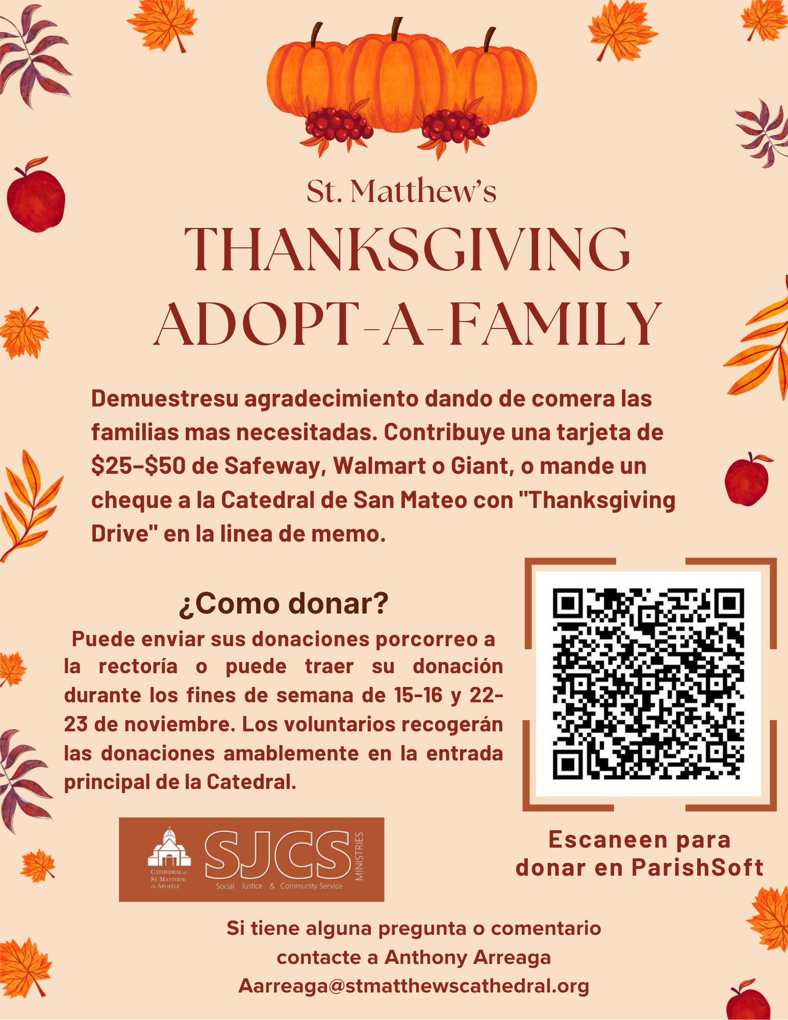 Comité de Justicia Social de St. Matthew's está recolectando tarjetas de regalo de la tienda de comestibles para distribuirlas a las familias necesitadas este Día de Acción de Gracias. Las donaciones financieras de cualquier monto también son bienvenidas. Consulte el folleto para obtener más detalles.