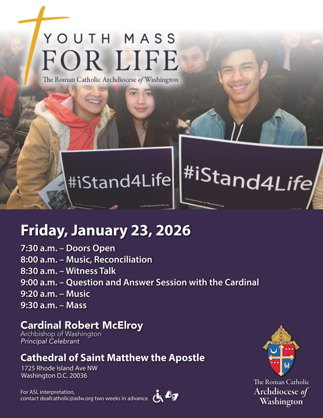 Youth from The Roman Catholic Archdiocese of Washington are invited to participate in a Youth Mass of Celebration and Thanksgiving at the Cathedral of Saint Matthew the Apostle in Washington, D.C. on Friday, January 23, 2026. Watch the ADW livestream HERE.