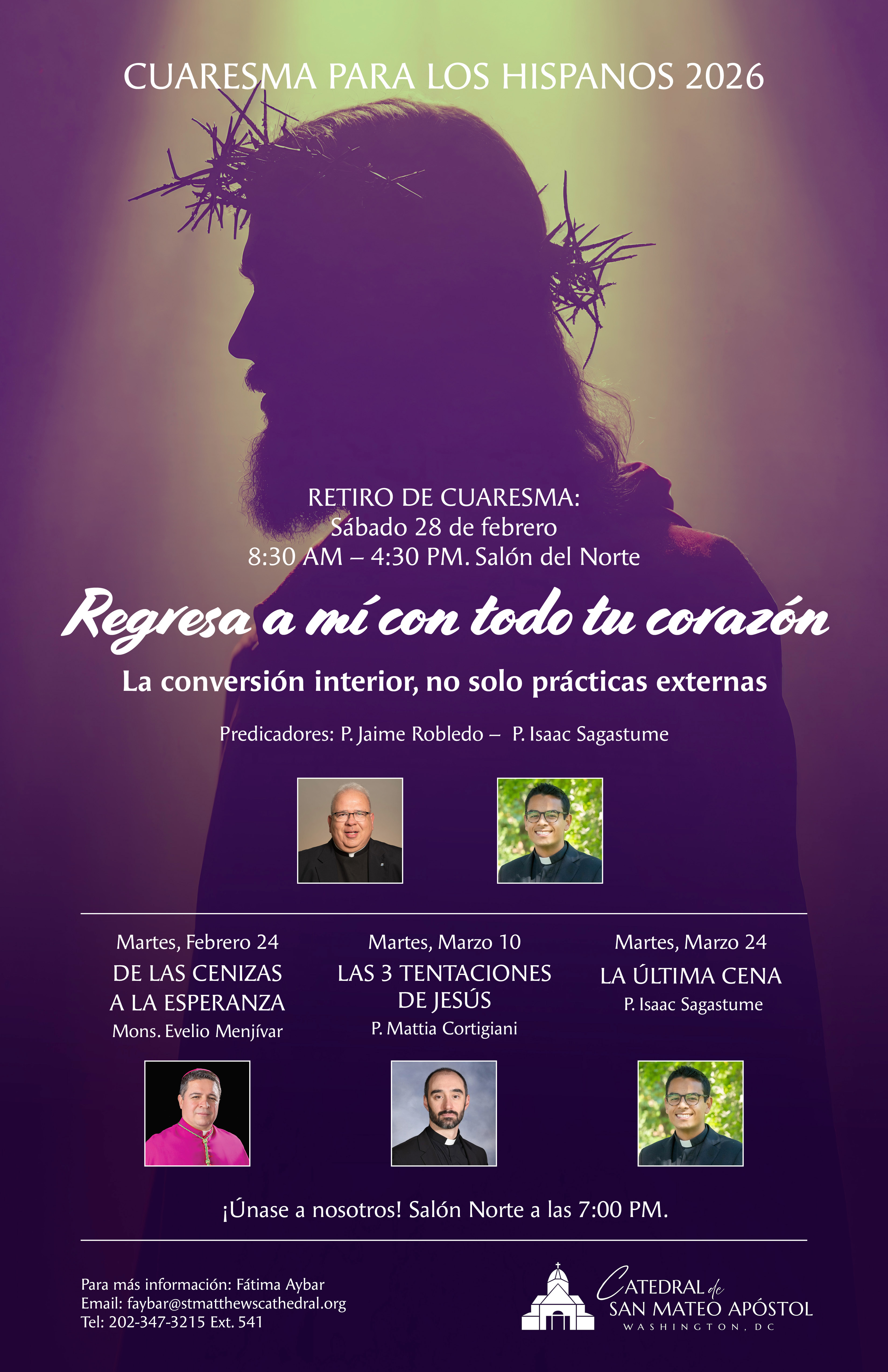 Sábado 28 de febrero, a las 8:30am a 4:30pm, Retiro de Cuaresma con P. Jaime Robledo y P. Isaac Sagastume, Salón del Norte. Entrada por el garje.