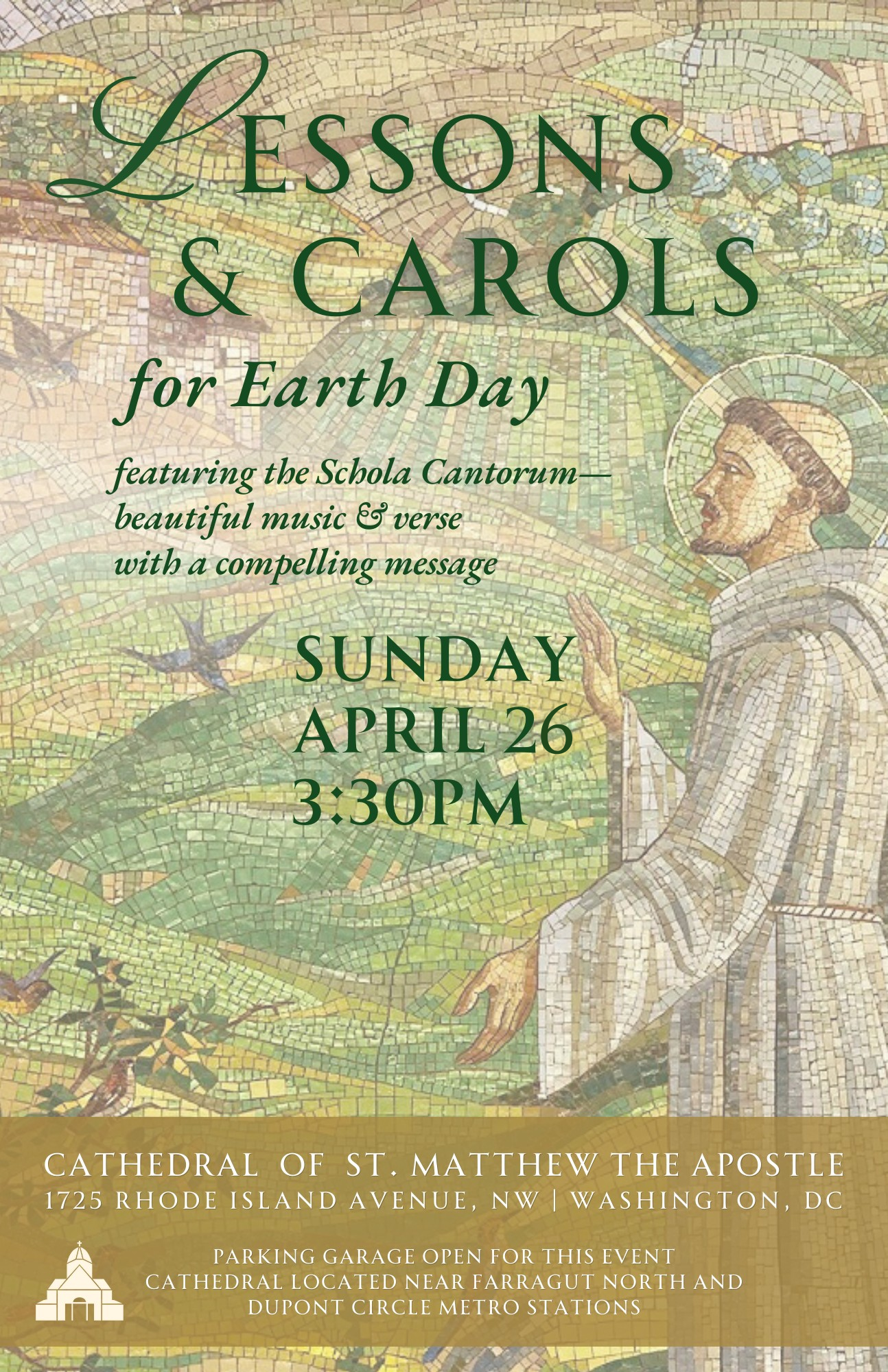 Come to the Cathedral on the afternoon of Sunday, April 26, 2026 to join in St. Matthew’s fourth annual celebration of Lessons and Carols for Earth Day. Msgr. Jameson, Cathedral Rector, presides at this 3:30pm service that features the Cathedral Schola Cantorum in cooperation with the St. Matthew's Creation Care Green Team.